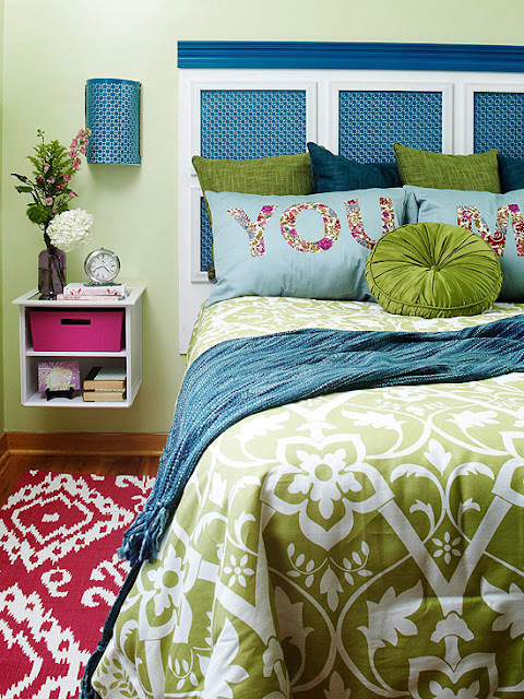 Fun projects and fresh color transformed this once uninspired bedroom, all on a budget of $350.