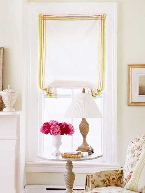 Confining the embellishment to the edges of this Roman shade keeps the look clean. As the shade is raised, the ribboned edges fall into graceful pleats. We combined several different widths and colors of ribbon. After planning the design, stretch the shade out on a flat surface and glue the ribbons around the outside edges one layer at a time. Allow the ribbons to extend an inch beyond the shade width so they can be folded over and glued to the back for a finished look.